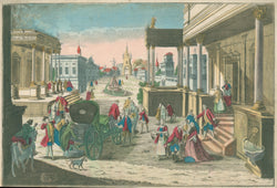 Perspective views, or vues d’ optiques, are a special type of popular print published in Europe during the eighteenth century. These prints were a form of entertainment meant to be seen through devices called "optical machines," "optiques," "zograscopes" or "peepshows." The prints were exhibited by traveling showmen in the streets throughout Europe and also were collected by those in the professional and upper classes who had the optical machines at home. There was a great curiosity about the appearance of unvisited European cities and exotic locations in the further reaches of the globe, and these prints were one of the only ways the general public could get a look at the wider world. When displayed in the optique, the prints were able to transport the viewer into a faraway place, an unknown city, or perhaps into the midst of a dramatic bit of contemporary history or to the distant past. While some of these prints are based on first-hand drawings, others are strictly imaginary or at least untruthful. The artists who etched them usually copied other prints or paintings and were quite unabashed in their willingness to take a beautiful, unnamed harbor from a painting by Claude Lorraine and call it, for example, Rotterdam.