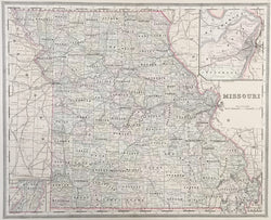 From Bradley's Atlas of the World for Commercial and Library Reference. Philadelphia: Wm. M. Bradley & Bro., 1885. 17 x 21. Lithograph. With inset bottom left of Dunklin, Pemiscot and lower New Madrid Counties, plus an inset top right of the vicinity of St. Louis. Original hand color.