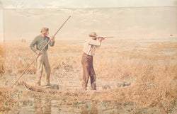 Shortly after the appearance of the Gould portfolio, a similar portfolio, Shooting Pictures, was issued by Scribner & Sons. It consisted of twelve chromolithographs after Frost. Originally sold by subscription, each of the six parts included two prints and two text sheets. Also included were three pen and ink illustrations of shooting incidents, executed by Frost. The original subscription was limited to 2500 copies, but due to its size and cumbersomeness, many of the portfolios were broken up, the prints often being framed for display. The use of the lighter, French-style of chromolithography enabled the prints to capture the warmth and richness of the original watercolors.
