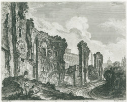 Though French by birth, Jean Barbault (1718-1762), who studied under Jean Restout II, is best known for his views of Italy where he moved at age 29. His activity as an artist and etcher was much inspired by the Imperialistic art culture current in Rome at the time, and most notably of Giovanni Battista Piranesi, for whom he engraved some plates for the Vedute di Roma and Le Antichita Romane. Barbault entered the Académie de France in Rome, where he studied until he was thrown out for having married, a situation forbidden for Academicians. He is best known for his publication of his Collection Of Views, Most Beautiful Ancient Monuments Of Rome And Surroundings; Barbault’s views of Rome emphasize the public spaces and buildings, the piazzas and other open spaces, with little notice given to the people of the city. The prints showing ancient temples, ruins and dramatic landscapes are elegantly depicted showcasing the past grandeur of the “Eternal City.”