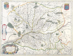 A wonderfully decorative map of this French region by Willem (Guilielmus) Janszoon Blaeu (1571-1638), the progenitor of the famous Blaeu cartographic firm of Amsterdam. Blaeu studied astronomy and sciences with Tycho Brahe, and in 1599 established a globe and instrument making business which soon expanded to include cartographic and geographic publishing. This firm was to go on to become the largest and most important cartographic publishing firms in the world, run by his sons Cornelis (until his death in 1642) and Joan. The maps issued by the Blaeu firm are known for their fine craftsmanship and design, and have been called “the highest expression of Dutch cartographical art.” These maps, with their excellent original color, are premier examples of the Blaeu output.