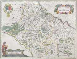 A wonderful decorative map of this French region by Willem (Guilielmus) Janszoon Blaeu (1571-1638), the progenitor of the famous Blaeu cartographic firm of Amsterdam. Blaeu studied astronomy and sciences with Tycho Brahe, and in 1599 established a globe and instrument making business which soon expanded to include cartographic and geographic publishing. This firm was to go on to become the largest and most important cartographic publishing firms in the world, run by his sons Cornelis (until his death in 1642) and Joan. The maps issued by the Blaeu firm are known for their fine craftsmanship and design, and have been called “the highest expression of Dutch cartographical art.” These maps, with their excellent original color, are premier examples of the Blaeu output.