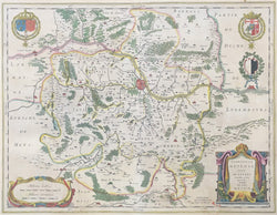 A wonderfully decorative map of this French region by Willem (Guilielmus) Janszoon Blaeu (1571-1638), the progenitor of the famous Blaeu cartographic firm of Amsterdam. Blaeu studied astronomy and sciences with Tycho Brahe, and in 1599 established a globe and instrument making business which soon expanded to include cartographic and geographic publishing. This firm was to go on to become the largest and most important cartographic publishing firms in the world, run by his sons Cornelis (until his death in 1642) and Joan. The maps issued by the Blaeu firm are known for their fine craftsmanship and design, and have been called “the highest expression of Dutch cartographical art.” These maps, with their excellent original color, are premier examples of the Blaeu output.