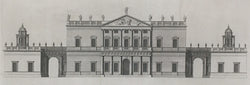 A print from a series of distinguished architectural views and plans of important contemporaneous British buildings, by one of England's famed 18th-century architects. Colen Campbell's purpose, through these large and beautifully executed drawings, was to praise and promote a great school of neo-Palladian design and building by proudly illustrating the work of his notable contemporaries, such as Inigo Jones. As the title of the work suggests, his aim was to link England's glorious present with the concerns of the exalted first century B.C.E. 'classical' architect, Vitruvius.