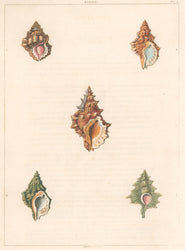 A beautifully rendered print from Perry's Conchology. These are the only prints of shells made by that most elaborate and rich process of aquatinting. The plates are decorative and inventive pictures of shells colored richly and idiosyncratically. Though he was criticized in contemporary natural history circles for his apparent whimsy and lack of scientific concern, Perry has since been greatly vindicated. His Conchology is now considered a serious work and his "absurd" names have become generally accepted. Whatever the resolution of this scientific debate, the prints were produced with the highest craftsmanship, and are undeniably beautiful.