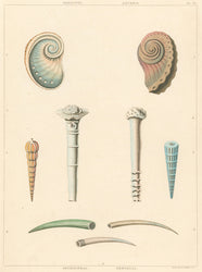 A beautifully rendered print from Perry's Conchology. These are the only prints of shells made by that most elaborate and rich process of aquatinting. The plates are decorative and inventive pictures of shells colored richly and idiosyncratically. Though he was criticized in contemporary natural history circles for his apparent whimsy and lack of scientific concern, Perry has since been greatly vindicated. His Conchology is now considered a serious work and his "absurd" names have become generally accepted. Whatever the resolution of this scientific debate, the prints were produced with the highest craftsmanship, and are undeniably beautiful.