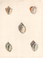 A beautifully rendered print from Perry's Conchology. These are the only prints of shells made by that most elaborate and rich process of aquatinting. The plates are decorative and inventive pictures of shells colored richly and idiosyncratically. Though he was criticized in contemporary natural history circles for his apparent whimsy and lack of scientific concern, Perry has since been greatly vindicated. His Conchology is now considered a serious work and his "absurd" names have become generally accepted. Whatever the resolution of this scientific debate, the prints were produced with the highest craftsmanship, and are undeniably beautiful.