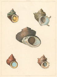 A beautifully rendered print from Perry's Conchology. These are the only prints of shells made by that most elaborate and rich process of aquatinting. The plates are decorative and inventive pictures of shells colored richly and idiosyncratically. Though he was criticized in contemporary natural history circles for his apparent whimsy and lack of scientific concern, Perry has since been greatly vindicated. His Conchology is now considered a serious work and his "absurd" names have become generally accepted. Whatever the resolution of this scientific debate, the prints were produced with the highest craftsmanship, and are undeniably beautiful.