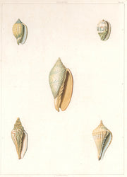 A beautifully rendered print from Perry's Conchology. These are the only prints of shells made by that most elaborate and rich process of aquatinting. The plates are decorative and inventive pictures of shells colored richly and idiosyncratically. Though he was criticized in contemporary natural history circles for his apparent whimsy and lack of scientific concern, Perry has since been greatly vindicated. His Conchology is now considered a serious work and his "absurd" names have become generally accepted. Whatever the resolution of this scientific debate, the prints were produced with the highest craftsmanship, and are undeniably beautiful.