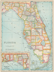A colorful, detailed map of the state of Florida from the latter part of the nineteenth century.  The George Cram Company was an engraving and publishing firm from Chicago.  In the mid-nineteenth century, the center of cartographic publishing was New York City, but in the 1880’s this began to shift towards Chicago with the advent of the Rand, McNally and Cram firms.  These firms were noted for their efficient output of precise maps filled with useful and up-to-date political and cultural information, and details on roads, towns, railroads, and so forth.