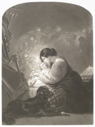 Below the image, an excerpt for the Irish poet Samuel Lover's ballad, "The Angel's Whisper," lends a title to the print and enhances its tender effect. Celebrating both virtuosity of motherhood and the saintliness of children, this print is a beautiful example of Victorian sensibility and sentiment.