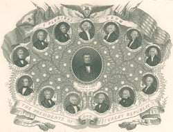 This intricate engraving celebrates the latest president of the United States along with his predecessors. The assemblage is surmounted by an eagle with the crest of the U.S. on his chest and holding the arrows of war and the olive branch of peace. Massed flags drape top and sides, and olive branches are entwined among the presidential portraits and stars which represent the states. The motto “E Pluribus Unum” appeals for an end of sectionalism which was currently dividing the states in conflicts that would lead to Civil War in a mere seven years.