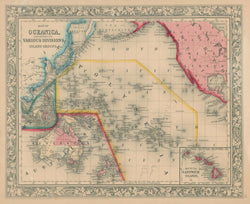 For most of the middle part of the nineteenth century, the firm founded by S. Augustus Mitchell dominated American cartography in output and influence. This fine map is from one of his son's atlases. The map depicts the Pacific, its islands and surrounding continental coastlines. Each nation is colored in a contrasting pastel shade. A fine decorative border surrounds the map, and the whole effect makes for an attractive mid-nineteenth century map.
