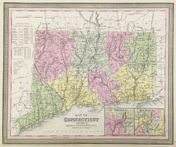 A strong and beautifully crafted map of Connecticut from the mid-nineteenth century, published by Thomas, Cowperthwait & Co.. This firm took over the publication of S. Augustus Mitchell's important Universal Atlas in 1850, and they continued to produce up-dated maps that were amongst the best issued in the period. The map is filled with myriad topographical details, including rivers, towns, lakes and political borders. The Thomas, Cowperthwait & Co. maps are especially known for their depiction of the transportation routes of the states, and this map is no exception. The transportation infrastructure was extremely important at this period of increased immigration and travel. This information is clearly depicted here, including rail lines, steamboat routes, canals and roads. Two inset maps are included, of Hartford and New Haven.