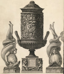 Giovanni Battista Piranesi (1720-78) is renowned for his splendid views of ancient and modern Rome. In a life time dedicated to recording these magnificent buildings and mysterious ruins, he created a prodigious oeuvre of dramatic and moving images. The large scale Vedute di Roma is one of the best known and most extensive series, and the one that established Piranesi’s reputation. Much of his earlier work, namely the Grotteschi and the Carceri, was more fantastic in subject matter. His series on decorative items were designed to accompany his larger views of principal sites, and they are equally monumental. As such, they became very sought after souvenirs for tourists in Rome, especially the British. Giovanni worked on the Vasi series from 1768 to 1778, and his son Francesco, who had engraved most of the plates in the series, completed the final eight plates between 1779 and 1786.