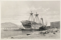 A delicate, yet accurate print of an old French ship of the line quietly moored in a harbor. The view is from the stern, and all the ships gunports are shown open. The top of her masts have been removed and only the lower portion remain. Out in the harbor is a similar craft with her masts cut down as well.