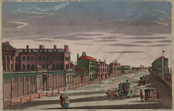 This print is a perspective view, or vue d’optique, a special type of popular print published in England and on the continent during the eighteenth century. These prints were a form of entertainment meant to be seen through devices called “optical machines,” “optiques,” or “peepshows.” The prints were exhibited by traveling showmen in the streets throughout Europe and would also have been collected by those in the professional and upper classes who had the optical machines at home. This machine used a lens to enhance for viewers the magnification and perception of three-dimensional depth of the prints. A mirror was often used so that the perspective prints could be viewed when laid flat, and this meant the image was viewed in reverse. Therefore, it is not unusual that the scenes shown in these prints were drawn in reverse, and there is also often a title printed in reverse along the top, allowing the viewers to quickly read the title. There was usually further text at the bottom of the prints, often in several languages, which could be read by the operator of the optique for the benefit of his audience. The most characteristic feature of the perspective views is their emphasized linear perspective, done to further intensify the enhanced appearance of depth and illusionistic space in the prints when viewed through an optique. When displayed in the optique, the prints could transport the viewer to a far away place– an unknown city, or perhaps into the midst of a dramatic bit of contemporary history. Another attribute of these prints is their bright, often crude hand coloring, applied boldly so as to show the tints when viewed through the lens. A further delightful aspect of these prints is their at times imaginary settings. The artists who etched them usually copied other prints or paintings and were quite unabashed in their willingness to take a beautiful, unnamed harbor from a painting by Claude Lorraine and call it, for example, Rotterdam. These cheerful and colorful images, with their fascinating history and unusual appearance, make for unusual and appealing eighteenth-century prints, and this is a fine example of the genre.
