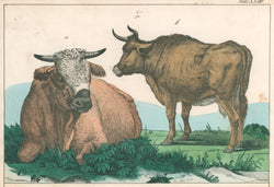 A strong image of cattle from a colorful series of German natural history prints from near the middle of the nineteenth century. The prints were issued in a volume whose title roughly translated is, “Natural History of Animals in Pictures... Pictures of Instruction for Children in School and the Home.” The images are thus visually simple and bold, yet intended to be accurate. The strong renderings and bright hand color make these prints visual delights, as well as wonderful documents of the past.