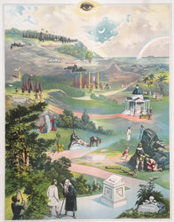 This colorful broadside illustrates the path of a member of the Independent Order of Odd Fellows, from initiation and through the different Degrees of membership. The three tenets of the order: Friendship, Love and Truth, are symbolized by a three-linked chain. The Daughters of Rebekah, the women's auxiliary branch, is also represented.