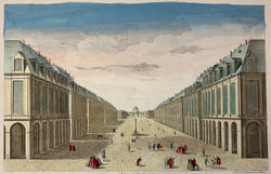 The optical machines used for these prints had a lens which enhanced for viewers the magnification and perception of three-dimensional depth of the scenes depicted. A mirror was often used so that the perspective prints could be viewed when laid flat, and in these cases the images were viewed in reverse. It is therefore not unusual that the scenes shown were drawn in reverse, and there is also often a title printed in reverse along the top, allowing the viewers to quickly read the title. There was usually further text at the bottom of the prints, often in several languages, which could be read by the operator of the optique for the benefit of his audience. The most characteristic feature of the perspective views is their emphasized linear perspective, done to further intensify the enhanced appearance of depth and illusionistic space in the prints when viewed through an optique. Another attribute of these prints is their bright, often crude hand coloring, applied boldly so to show the tints when viewed through the lens. The prints usually have a series of colors of blue, pink and yellow are common crossing in bands from side to side, with bright highlights often including red. These cheerful and colorful images, with their fascinating history and peculiar appearance, make for unusual and appealing eighteenth-century prints. It is quite common for these prints to have condition issues of sports, stains, tears… as these prints were meant to be handled and used and not framed.
