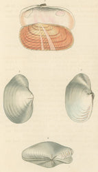 A print from a series of seashells by the respected conchologist, William Wood. Natural History prints were very popular throughout the Eighteenth and Nineteenth Centuries. Not only did they illustrate new found scientific knowledge, they did so in a decorative way. Artfully arranged, and brightly colored, these prints are a perfect example of that combination of science and art.