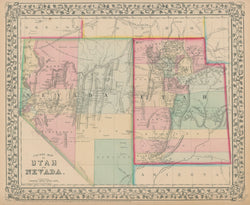 For most of the middle part of the nineteenth century, the firm founded by S. Augustus Mitchell, Sr. dominated American cartography in output and influence. This fine map is from one of his son's atlases, and it shows the territory of Utah and the state of Nevada in the final year of the Civil War. Towns, rivers, roads and other topographical information are clearly shown, and the counties are shaded with contrasting pastel colors. When Nevada became a state in 1864, the border of Utah and Nevada was moved east from the 115th to the 114th meridian. This map shows Nevada's correct eastern boundary at the 114th meridian, though a year or two earlier, Mitchell’s maps still showed the former border. Note also that Nevada extends south only to the 37 degree latitude. An interesting early rendering of the region.