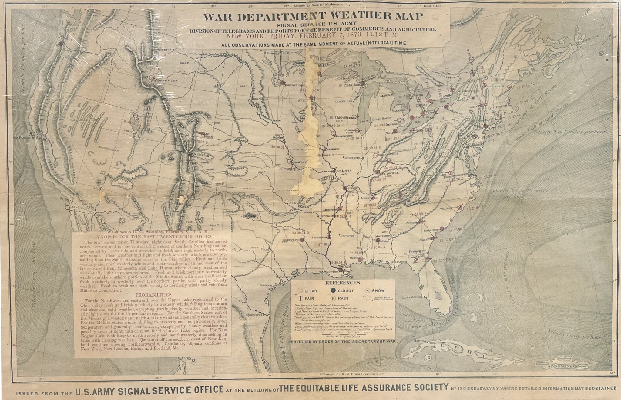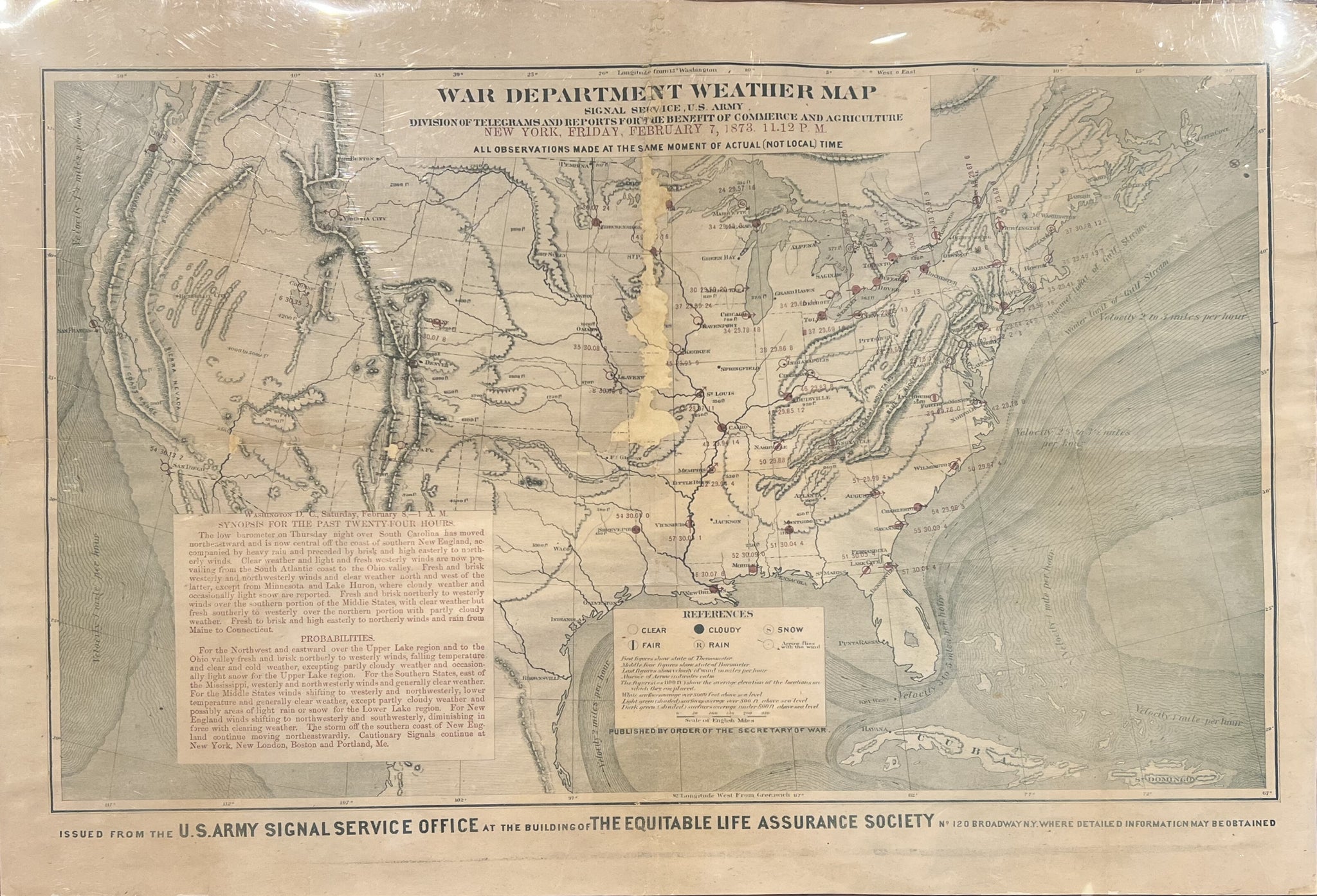 The map reflects a fascinating collaboration between the U.S. Army Signal Service Office (later the Signal Corps) and the Equitable Life Assurance Society, which prominently lists its address at 120 Broadway, New York City, inviting readers to obtain further information. Intended for immediate, short-term use, examples like this were typically discarded after a single day, making surviving copies potentially very scarce. Beyond its practical function, the map captures a pivotal moment in American history—when emerging science, government infrastructure, and the ambition to understand and control vast land and sea territories converged as the United States completed its continental expansion.