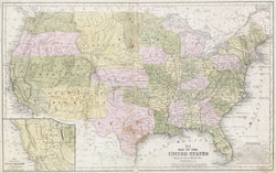 An excellent map of the United States from S. Augustus Mitchell's influential School Atlas. The maps shows the continental U.S. with good detail throughout, including a large Nebraska Territory reaching all the way to the Canadian border. The map depicts topographical information with clear precision, marking towns, rivers, roads, and counties. Other interesting features abound, including indications of mines, forts and Indian tribes.