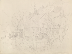 ca. 1930. 16 x 21 (paper). Pencil sketch. Top right and left hand corners chipped. Repaired tear at bottom. Faint water stain bottom right hand side. Not signed.