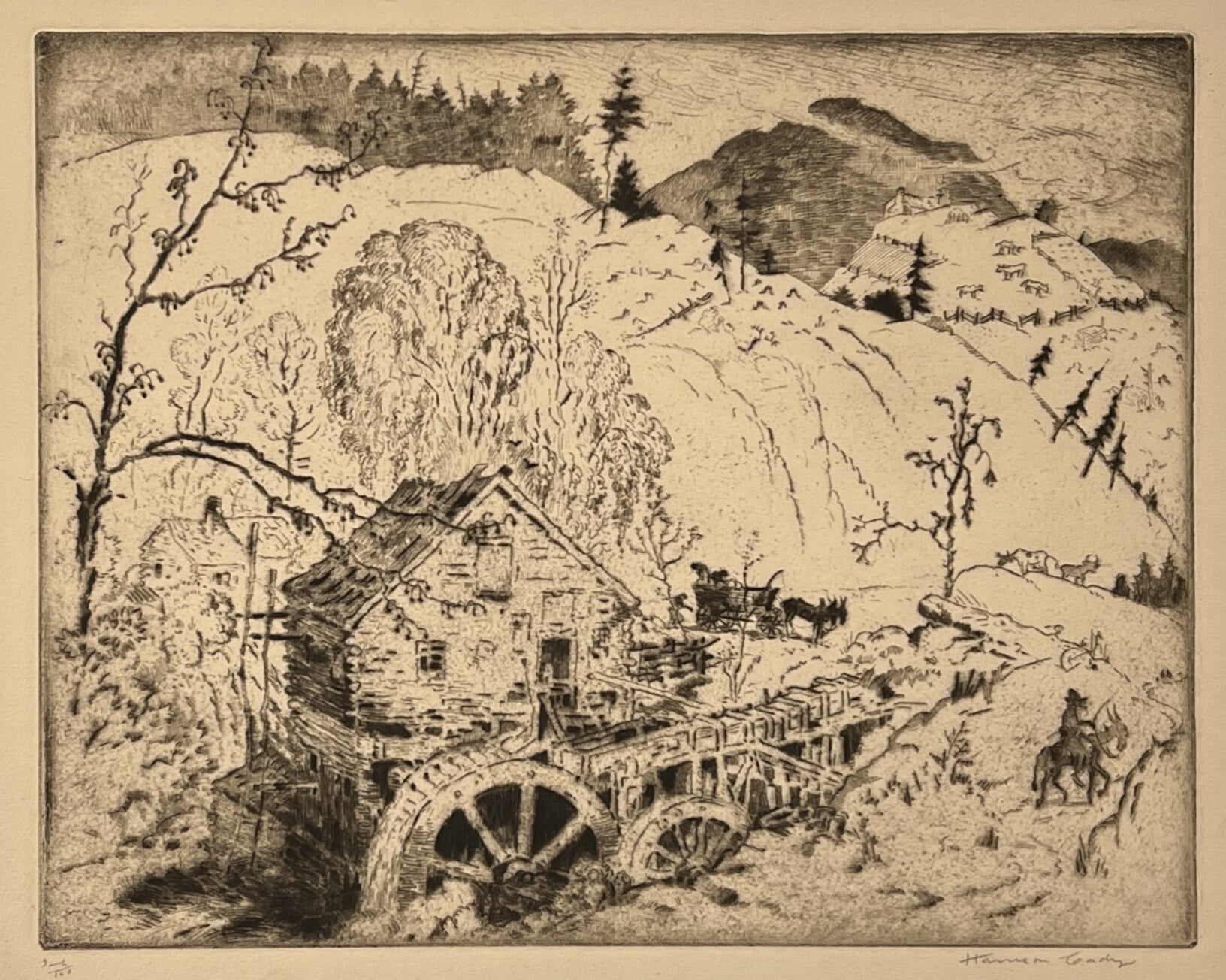 Travelling to Rockport, Maine, and the Carolina Mountains, Cady became interested in depicting the life that he saw passing away through the influence of such modern devices as the automobile. In paintings, drawings and in drypoint etchings Cady in the late ‘20s and early ‘30s blended raw experience with considerable conceptual sorting to create a visual record of this vanishing life.