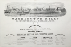 A lovely, detailed view of the Washington Mills on the Delaware in Gloucester, N.J. from one of the most interesting publications on Philadelphia, J.H. Colton’s mid-century Philadelphia Commercial Edition of the Atlas of America. Besides containing fine maps of North and South America, this volume included numerous advertisements for Philadelphia firms, both large and small. These have become a rare and prized part of the history of Philadelphia prints. This print is of the Washington Mills in Gloucester, N.J.. The mills are shown from the middle of the Delaware, the river brimming with vessels of all sorts. Below the view is a text advertisement for David S. Brown & Co., cloth merchants for Washington Mills and other manufacturers.