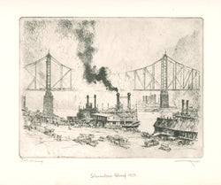 Although best known for his industrial designs, Otto Kuhler (1894-1977) is well regarded as a fine artist and draftsman. Born in Germany, Kuhler was the sole heir to his family's successful steel business, Kuhler Forges. After WWI however, the business and his family's fortune were in ruins. After living briefly in Dusseldorf, and partly due to the advice of friend Joseph Pennell, he took up etching and emigrated to the States in 1923. Otto Kuhler's etchings of begrimed industry sprang from the same optimistic response to technology that led to his colorful streamlined designs for the Milwaukee, Lehigh and other railroads in the 1930's. His prints bridge art and industry -- freely-sketched scenes that celebrate precise engineering and industrial might. This merging of industry and art proved so successful that after years of submitting designs, a locomotive based on Kuhler's designs was built. The engine, Hiawatha, rolled out of the Schenectady, New York yard in May, 1935. It was the first streamlined steam locomotive to be built from scratch in America. This signaled the start of the next phase of his career- as a successful industrial designer.