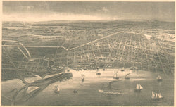 Beginning around mid-century, bird’s-eye views of American cities became very popular.  These were originally issued in the large folio size, but publishers, such as Charles Magnus of New York, soon realized that there was a market for smaller versions of these prints.  The Magnus views of this size appeared as book illustrations, letter head ornaments, and in this issue suitable for framing.