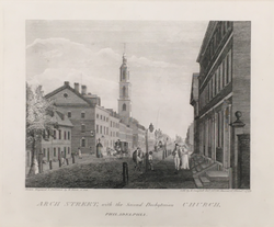 The project of producing this series was carried out entirely in Philadelphia, and while many other individuals had a role, including Birch's son Thomas who provided many of the original drawings, the prints were mostly the product of the efforts of William Birch. Not only did he conceive and plan the project, but he also drew many of the scenes. The first edition, published in 1800, included 27 plates engraved by S. Seymour, and it was a great success, its subscription list numbering 156, including Thomas Jefferson. This appealing glimpse of Arch Street shows The Second Presbyterian Church which stood at the northeast corner of Third and Arch Streets. The deep perspective view of the street down to the river, along with the details of street life, give a fine look at Philadelphia as a thriving turn of the century city.