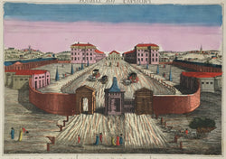 This print is a perspective view, or vue d’optique, a special type of popular print published in England and on the continent during the eighteenth century. These prints were a form of entertainment meant to be seen through devices called “optical machines,” “optiques,” or “peepshows.” The prints were exhibited by traveling showmen in the streets throughout Europe and would also have been collected by those in the professional and upper classes who had the optical machines at home. This machine used a lens to enhance for viewers the magnification and perception of three-dimensional depth of the prints. A mirror was often used so that the perspective prints could be viewed when laid flat, and this meant the image was viewed in reverse. Therefore, it is not unusual that the scenes shown in these prints were drawn in reverse, and there is also often a title printed in reverse along the top, allowing the viewers to quickly read the title. There was usually further text at the bottom of the prints, often in several languages, which could be read by the operator of the optique for the benefit of his audience. The most characteristic feature of the perspective views is their emphasized linear perspective, done to further intensify the enhanced appearance of depth and illusionistic space in the prints when viewed through an optique. When displayed in the optique, the prints could transport the viewer to a far away place– an unknown city, or perhaps into the midst of a dramatic bit of contemporary history. Another attribute of these prints is their bright, often crude hand coloring, applied boldly so as to show the tints when viewed through the lens. A further delightful aspect of these prints is their at times imaginary settings. The artists who etched them usually copied other prints or paintings and were quite unabashed in their willingness to take a beautiful, unnamed harbor from a painting by Claude Lorraine and call it, for example, Rotterdam. These cheerful and colorful images, with their fascinating history and unusual appearance, make for unusual and appealing eighteenth-century prints, and this is a fine example of the genre.