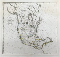 The map shows the best understanding of the continent prior to the explorations of Lewis & Clark. The map does show the lands of the Louisiana Purchase as belonging to the United States, with the northwestern most part named as "Quivira." The coastline, though, is quite accurate being based on the recent explorations of Vancouver and La Perouse. The river systems in the west are roughly and incorrectly shown, including the "Columbia or River of the West" extending so that it comes very close to some of the branches of the upper Mississippi. Some of the Indian tribes are noted, including Apacheria, Pimas and Yama. The nature of the Rocky Mountains is clearly not known, with the Canadian chain ending above the "River of the West" and there being only a small compact range near the headwaters of the Rio Grande and Colorado Rivers. An excellent map of the period.