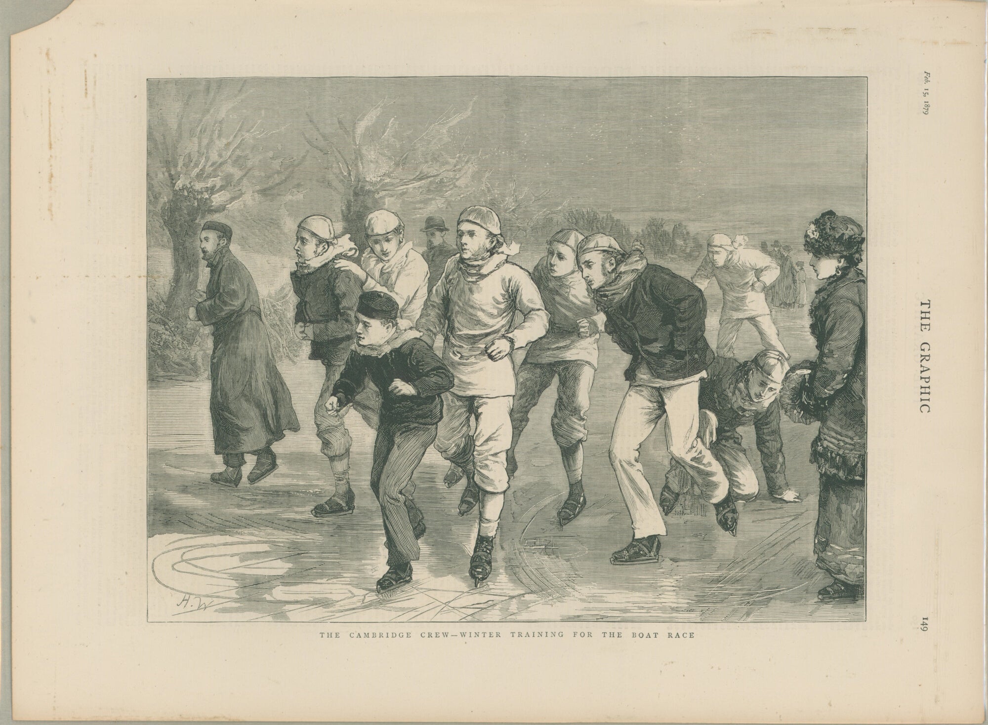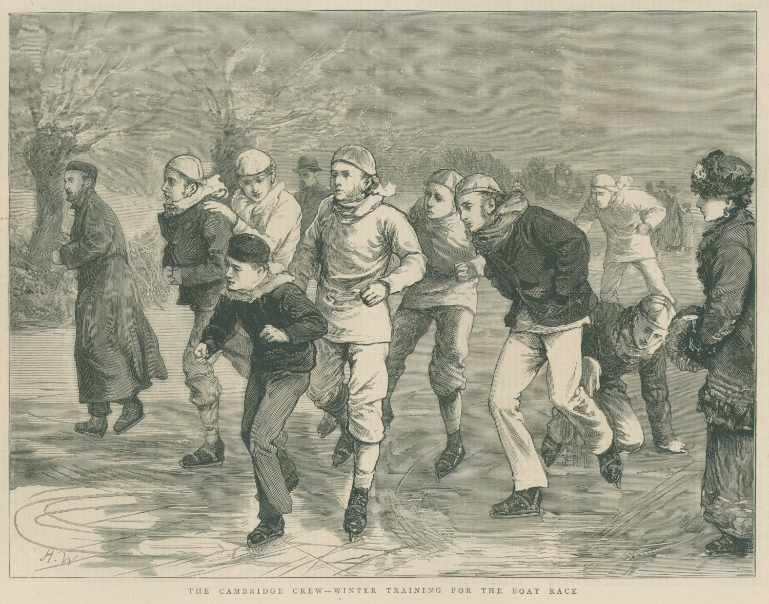 The scene shows members of the Cambridge boat team ice skating as a means of training.
