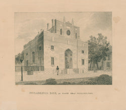 A lovely print from William Birch's City of Philadelphia, a portfolio of images illustrating different scenes of Birch's home town. This volume, when first issued in 1800, was the first comprehensive work on an American city, and its influence was great. Birch issued four editions of the portfolio, updating the work by discarding some prints and adding new scenes including some of buildings built since the volume was initially published. The Philadelphia Bank building was built on the corner of Fourth and Chestnut Streets in 1809, and it was architecturally important as one of the first Gothic Revival buildings in Philadelphia. This company eventually became the Philadelphia National Bank. Interesting to note, there are only two known prints of the Philadelphia Bank, this image and an unusual view called, "The Horizontorium."