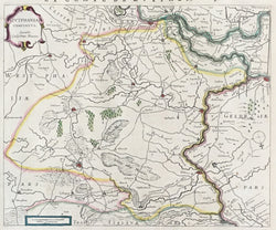 A map from a series of wonderfully decorative maps of France, Spain, the Netherlands and their regions by Willem (Guilielmus) Janszoon Blaeu (1571-1638), the progenitor of the famous Blaeu cartographic firm of Amsterdam. Blaeu studied astronomy and sciences with Tycho Brahe, and in 1599 established a globe and instrument making business which soon expanded to include cartographic and geographic publishing. This firm was to go on to become the largest and most important cartographic publishing firms in the world, run by his sons Cornelis (until his death in 1642) and Joan. The maps issued by the Blaeu firm are known for their fine craftsmanship and design, and have been called “the highest expression of Dutch cartographical art.” These maps, with their excellent original color, are premier examples of the Blaeu output.