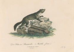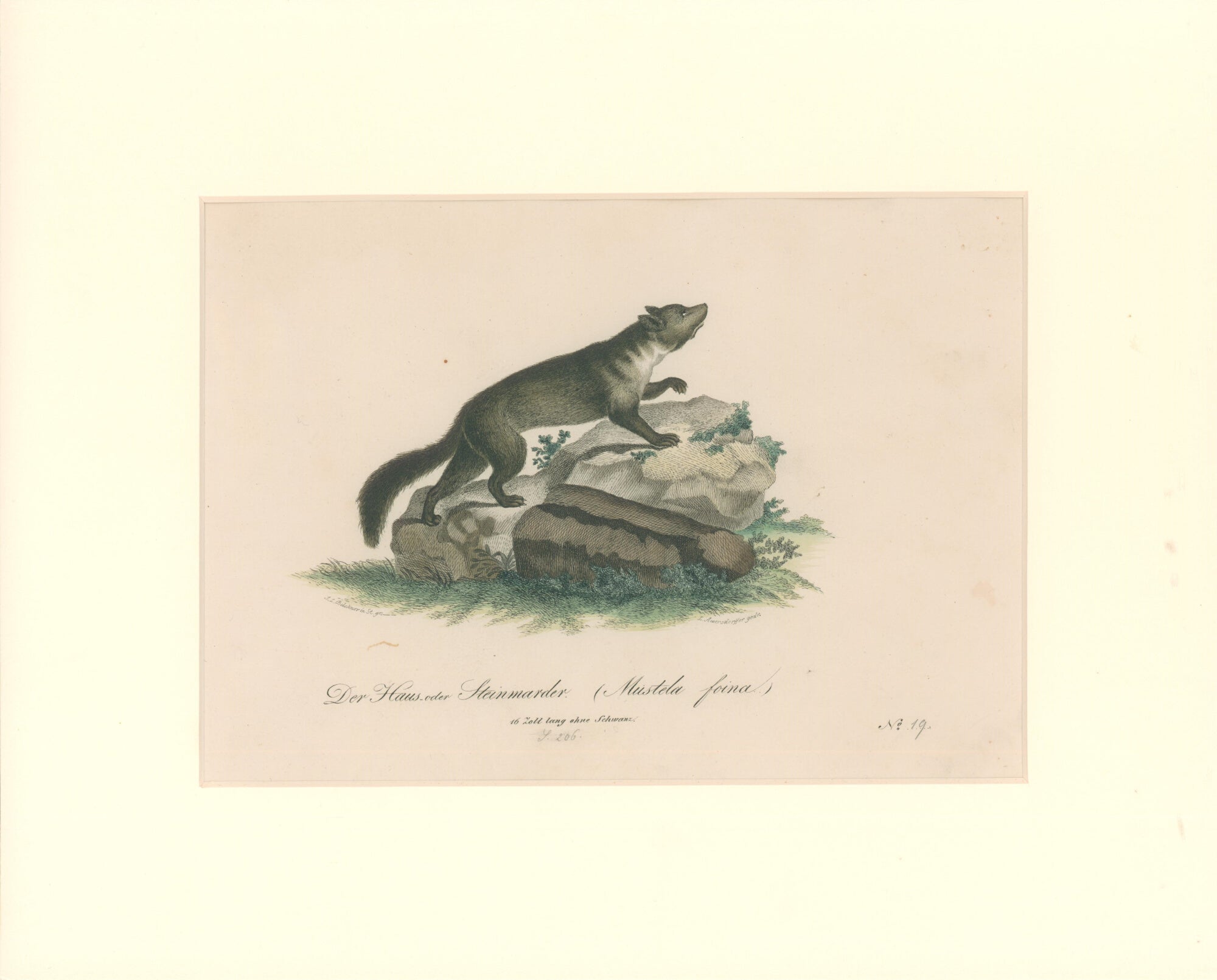 In the grand tradition of natural history prints, this image both delights the eye and informs the mind. Skillfully drafted, each animal in Büchner’s work appears in profile against a picturesque representation of its primary habitat. Clean, well-executed lithography shows off even fine details, like the texture of the animal’s fur coat. Original hand color enhances both the accuracy and the aesthetics of each print. To satisfy the curious viewer, average measurements are noted below titles. Though printed in German, this group of Säugethiere, or mammals, reaches far beyond western Europe to include species from parts of Africa and Asia alongside local animals. Beyond his language, little is known about artist J.L. Büchner, but his keen eye and skill place this series among finest educational and decorative natural history series of the early nineteenth century.