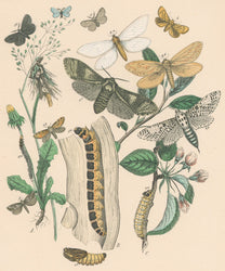 A print from a series of charming prints illustrating the complex varieties of European butterflies and moths. Each plate presents several types, shown as well in their successive stages of development. The insects are posed against the native flora that is their characteristic habitat. The refined drawing and delicate hand coloring meet well the challenge of these intricate and beautiful creatures, making for both educational and lovely images. These are prints that do proud the flourishing art of 19th-century natural history illustration.