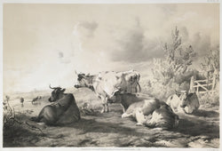 An atmospheric lithotint of cattle resting near a stream in the foreground, while others in the background take a drink, after Cooper's 1836 painting of the same title.