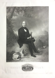 A striking, full length portrait of a middle-aged Clay sitting in the country near his home, Ashland. Clay sits on a mound with a dog at his feet, and Ashland is just visible in the distance. The house is also shown in a nicely engraved vignette remarque below the main image. This print is typical of the high-quality American portraits of the middle of the nineteenth century, with excellent engraving and impressive size. The print was first issued in 1843, in part to help the political career of Clay, who was gearing up for his Presidential bid of 1844. When Clay died, in 1852, there was a renewed interest in this great American, so R. Lewis and A. Harris, New York publishers, decided to reissue the engraving. Clay is shown in the middle of his career, as an educated man but one close to his Kentucky countryside. This handsome portrait would have graced many homes of his fellow citizens.