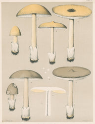 Both Edible and Poisonous Mushrooms were represented in his prints. The variety of fungus is identified with both by the Latin and English names.