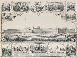 This is a nice example of one of the most attractive and interesting of the views of the buildings of the Centennial. New York publisher H. Schile's lithograph combines the various threads of meaning inherent in the Centennial. The center panel of the print shows the proposed main exhibition building in Fairmount Park, flags flying, surrounded by hordes of visitors, and even graced by a ethereal hot air balloon floating above. Above this image in the center is a symbolic figure representing America, holding the flag and flanked by the American eagle, as well as symbols of mechanics and agriculture. Around the center image are panels showing important scenes from American history, including episodes from the Revolution, the War of 1812, the Mexican-American War and the Civil War. Also shown are vignette scenes of Independence Hall and the exhibition's art gallery (present-day Memorial Hall). This print encapsulates, then, the meaning of the Centennial to Americans in 1875-76. Its pleasing appearance, scarcity, and historic interest makes it one of the most desirable of all Centennial prints.