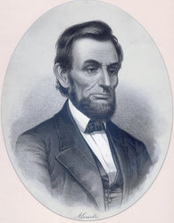 This portrait is based on the 1864 photograph by Anthony Berger done in Brady's studio. It is a large print and one of the most neat in the depiction of Lincoln's hair and clothing of all that we have examined. No hint of the back woods rail-splitter is here. Rather the image is of a strong and serious man with a mature beard and more hair than any other. The print fits with the message of victory approaching for the North in the Civil War, and it would have been welcomed for those mourning after Lincoln's assassination. Almost all oval portraits such as this would have been framed. Given the destructive materials used and climate in most homes, the fact that few of this printing are available is no surprise.